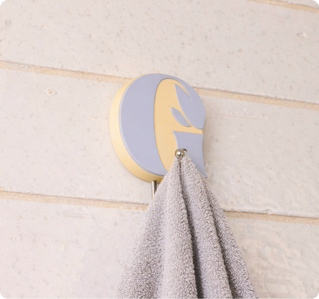A no-tools wall hook designed for bathroom routines. It features a moisture-resistant PVC backing, a metal hook, and a strong adhesive for a secure hold.